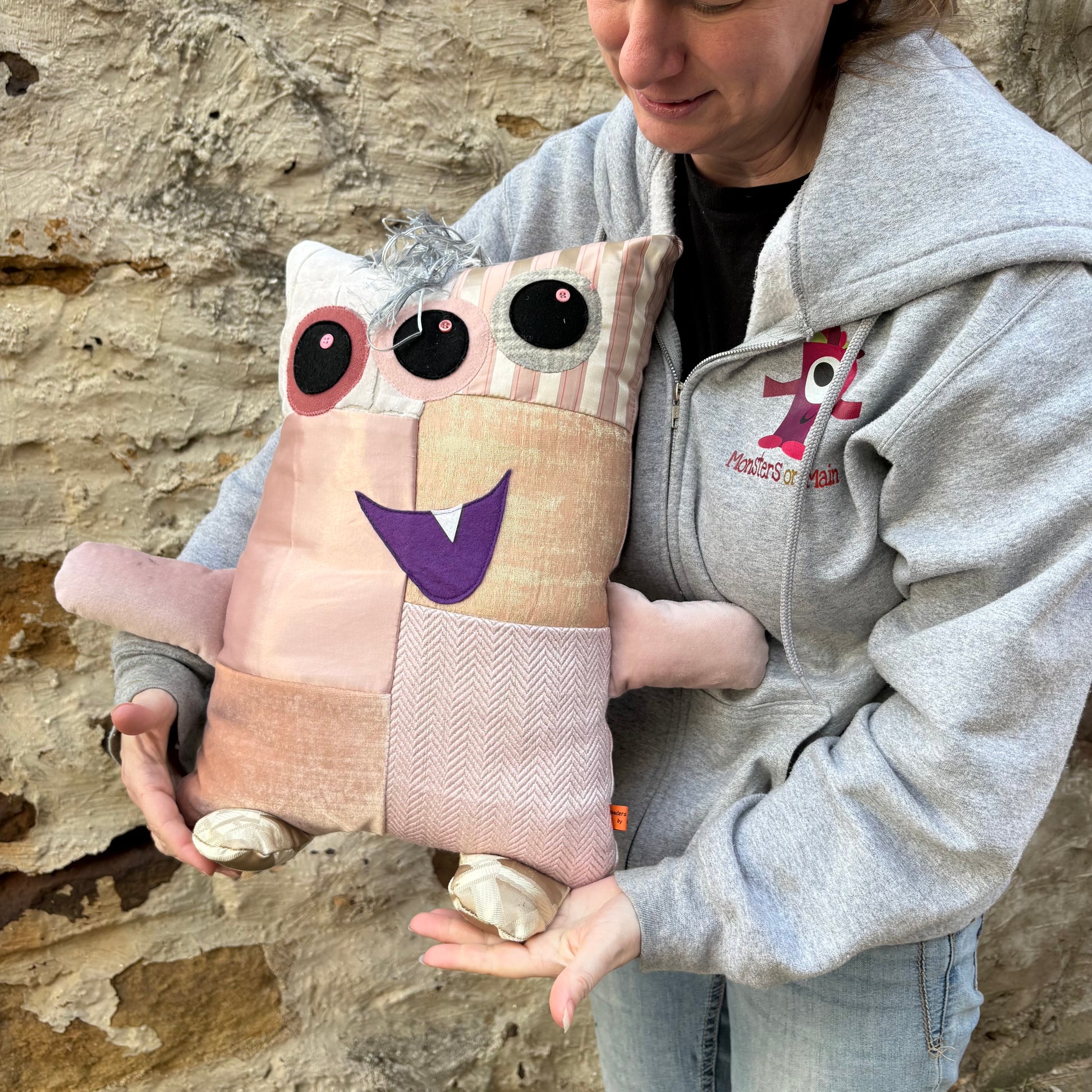 Meet Aimee, a cheerful light pink patchwork monster who's always ready for adventure! With her charming patchwork design and friendly personality, Aimee is the perfect companion for imaginative play and cozy cuddles. Whether she's splashing by the lake with her monster friends or joining you on everyday adventures, this lovable character brings joy and whimsy to any collection. Soft, huggable, and full of personality, Aimee is sure to become a treasured favorite.