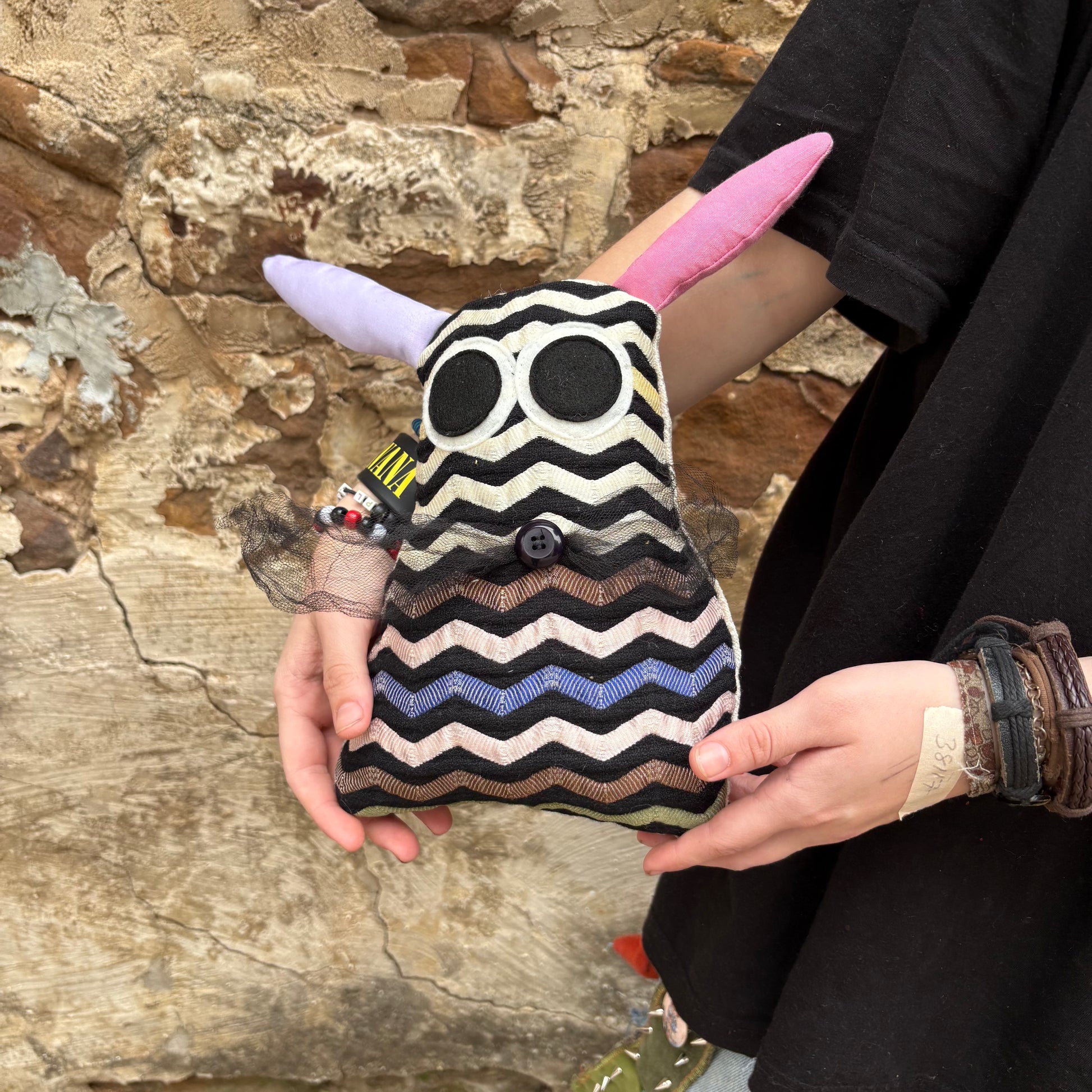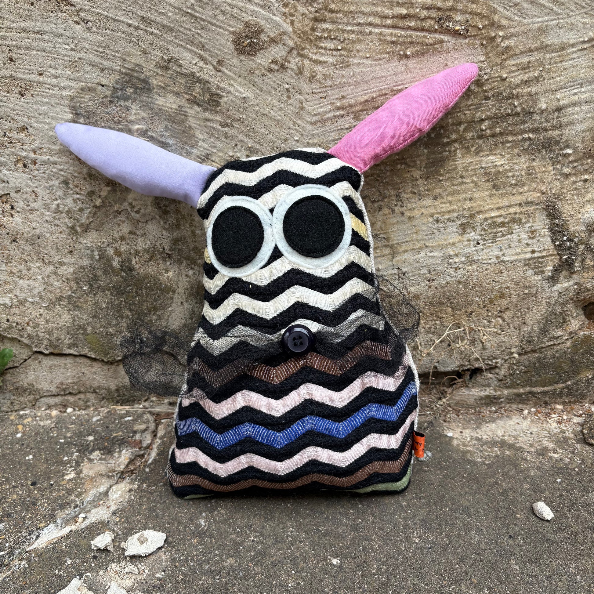 Meet Bopsy, a delightfully quirky plush companion featuring a vibrant zig-zag print that brings playful energy to any space. This adorable bunny monster combines soft, huggable charm with eye-catching geometric patterns that spark imagination and joy. Perfect for cuddling, collecting, or gifting to monster enthusiasts of all ages. Bopsy's unique design makes it a standout addition to any plush collection.