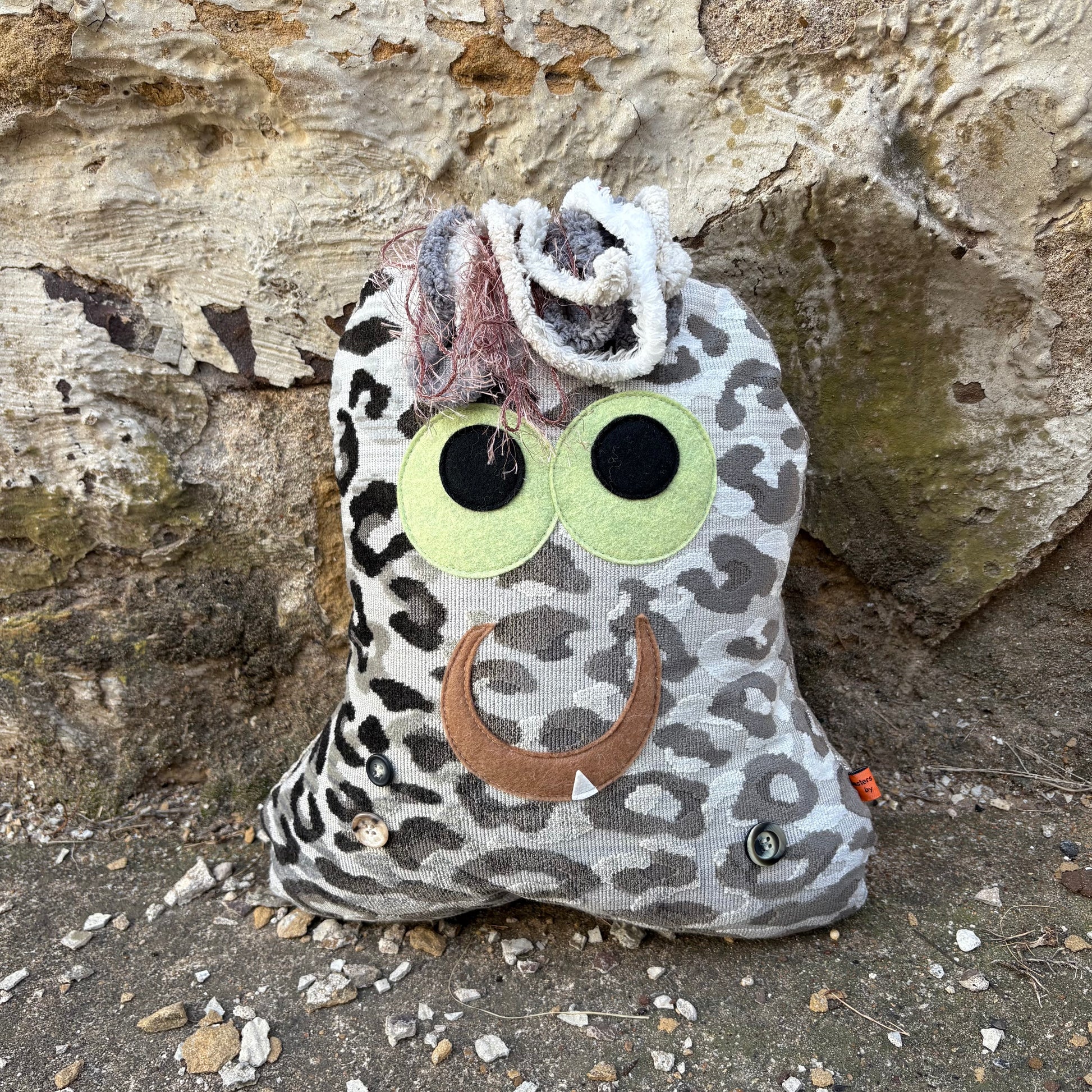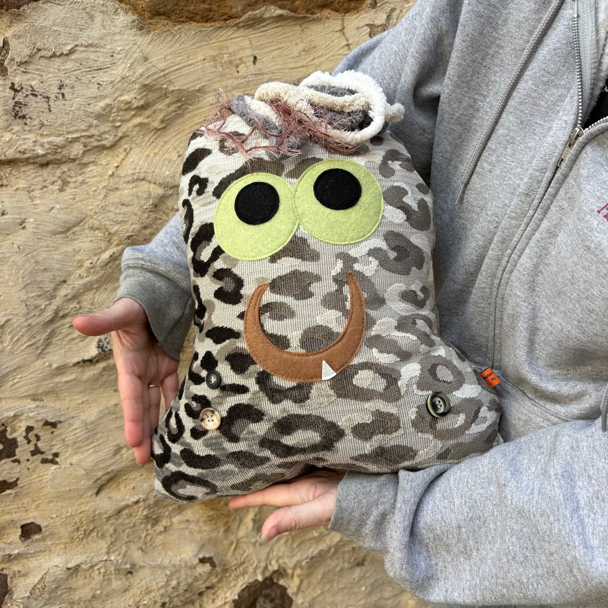 Meet Cleo, your new karaoke-loving companion! This large gray leopard print monster is ready to belt out tunes and bring the fun wherever she goes. With her bold spotted pattern and larger-than-life personality, Cleo's the perfect friend for music lovers and monster enthusiasts alike. Whether you're hosting a sing-along session or just need a quirky buddy to brighten your day, this melodious monster delivers charm and character in spades.