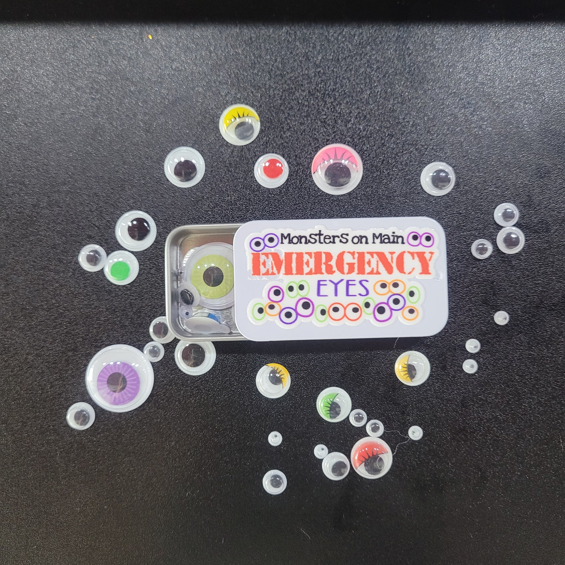 Metal tin with slide off top that holds a variety of eye balls. Contains random sizes and colors of eyes for crafts or party favors.