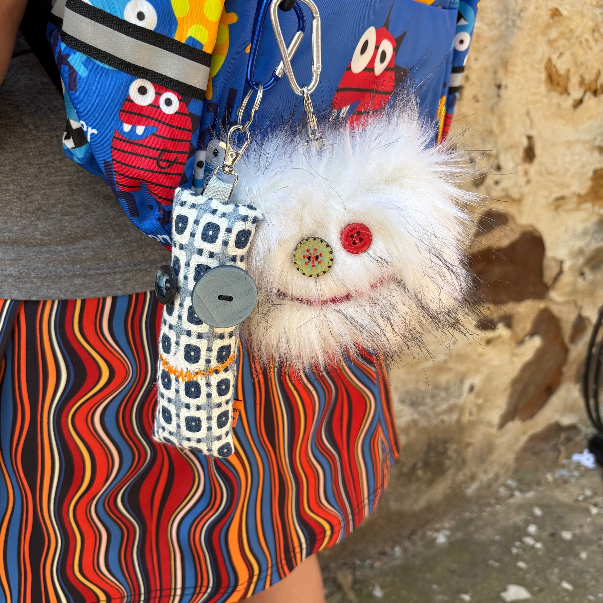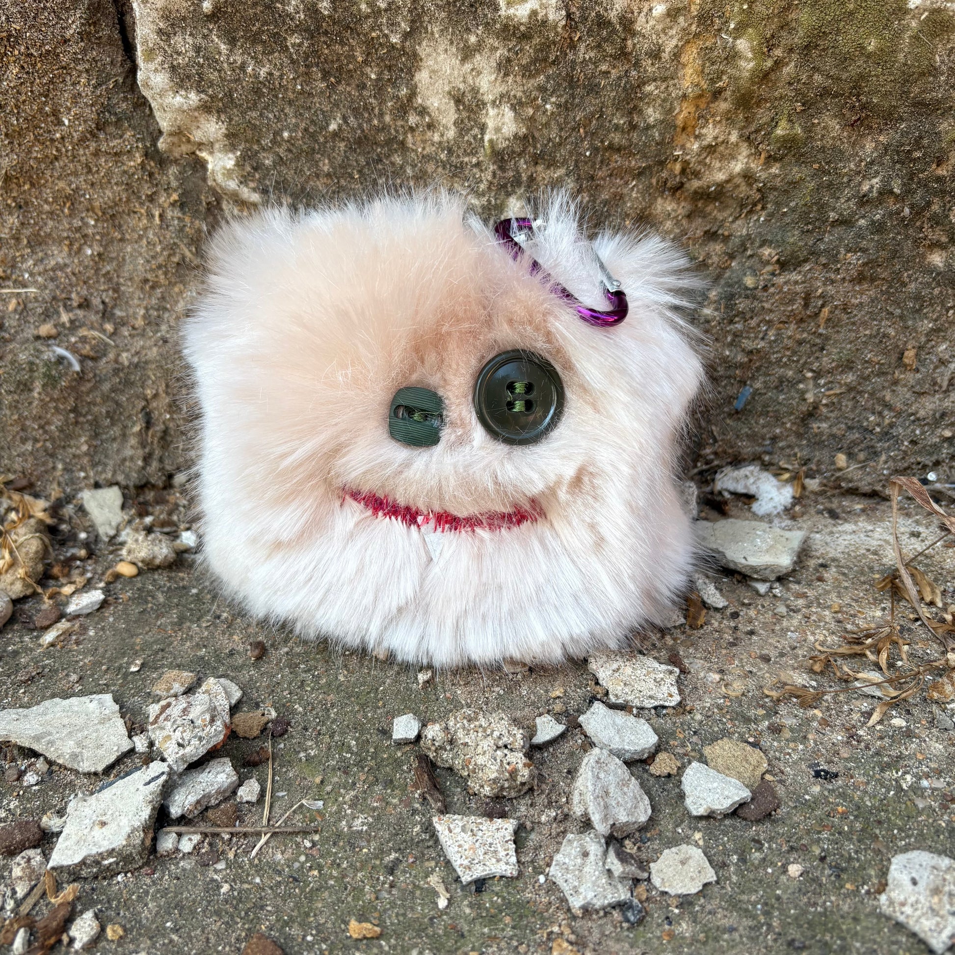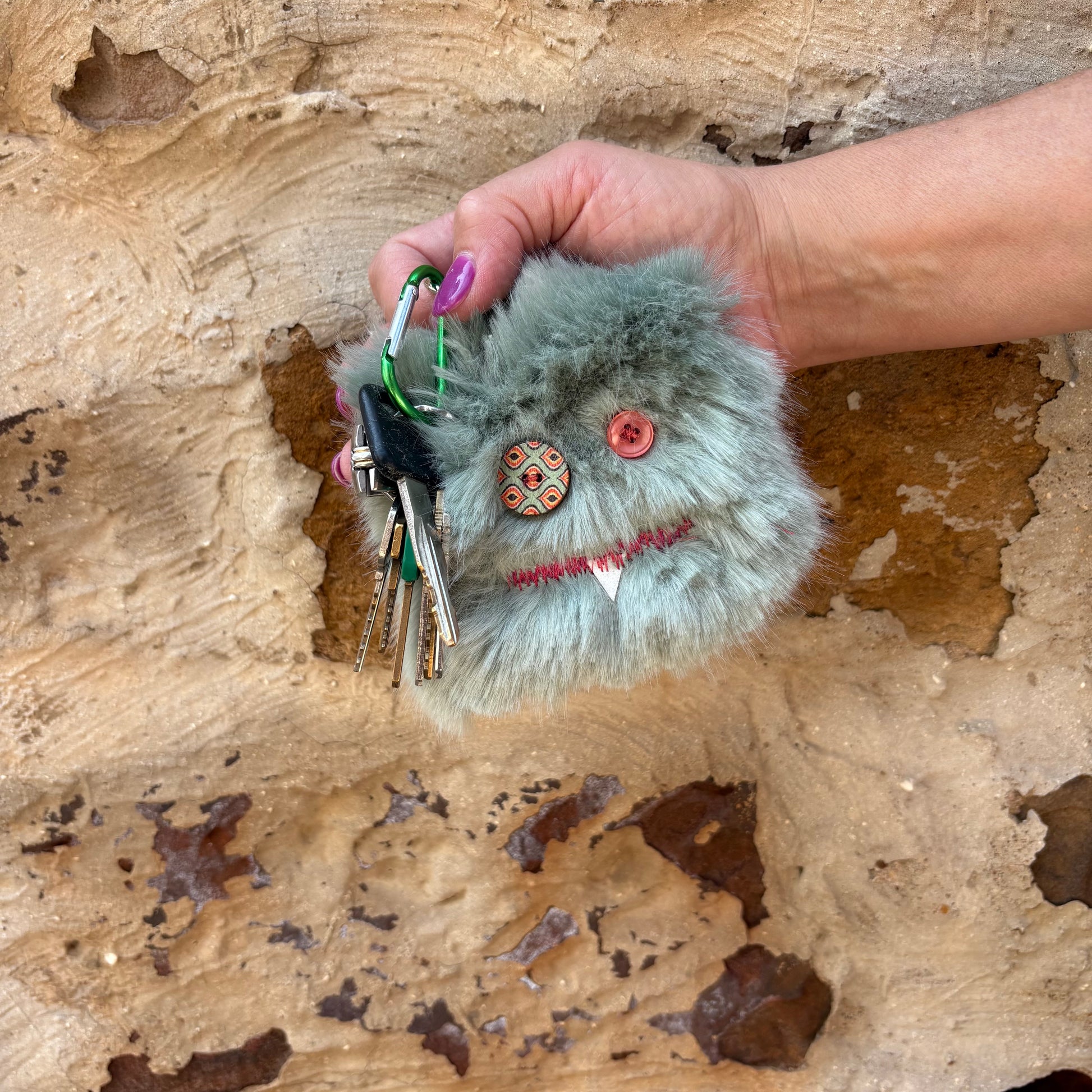 Fuzzy monster keychains with a fun personality. Deck out your bag or keys with our newest shop item. Tag-A-Long's will add a fun flair to any accessory! Approximately 3.5" x 3.5". Comes with small carabiner clip and snap clip on each Tag-A-Long.
