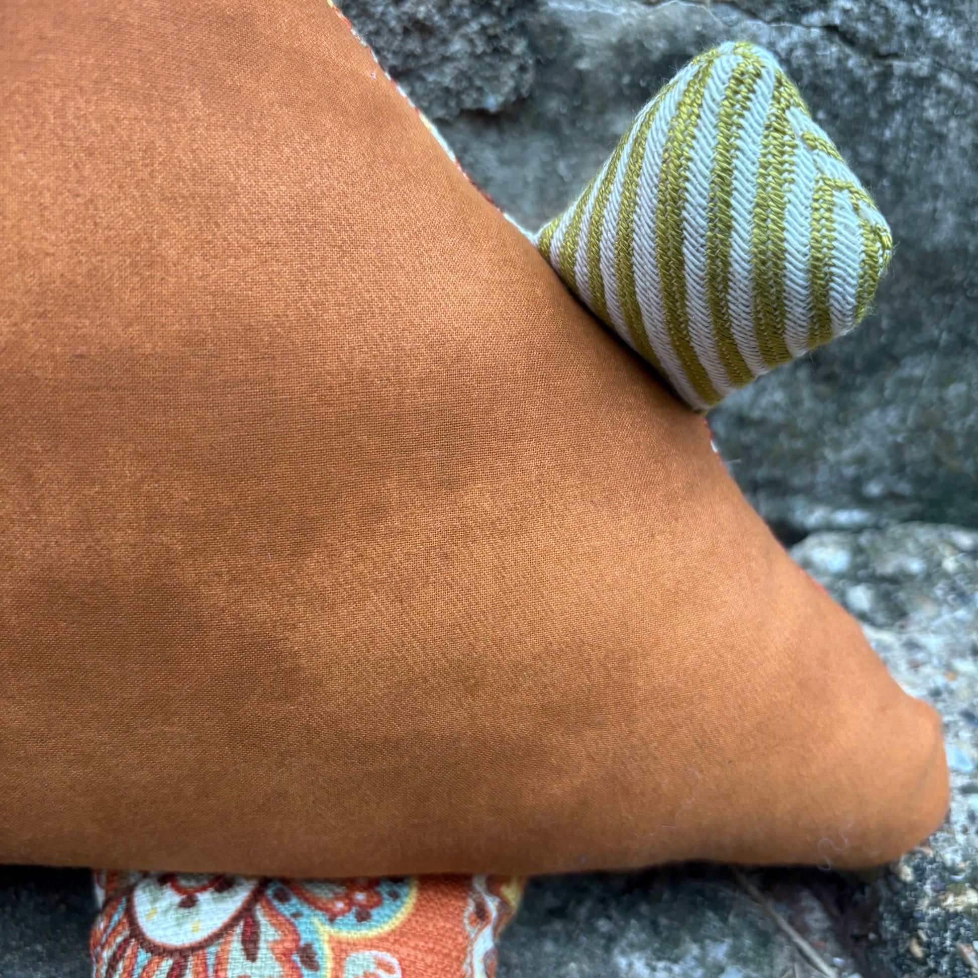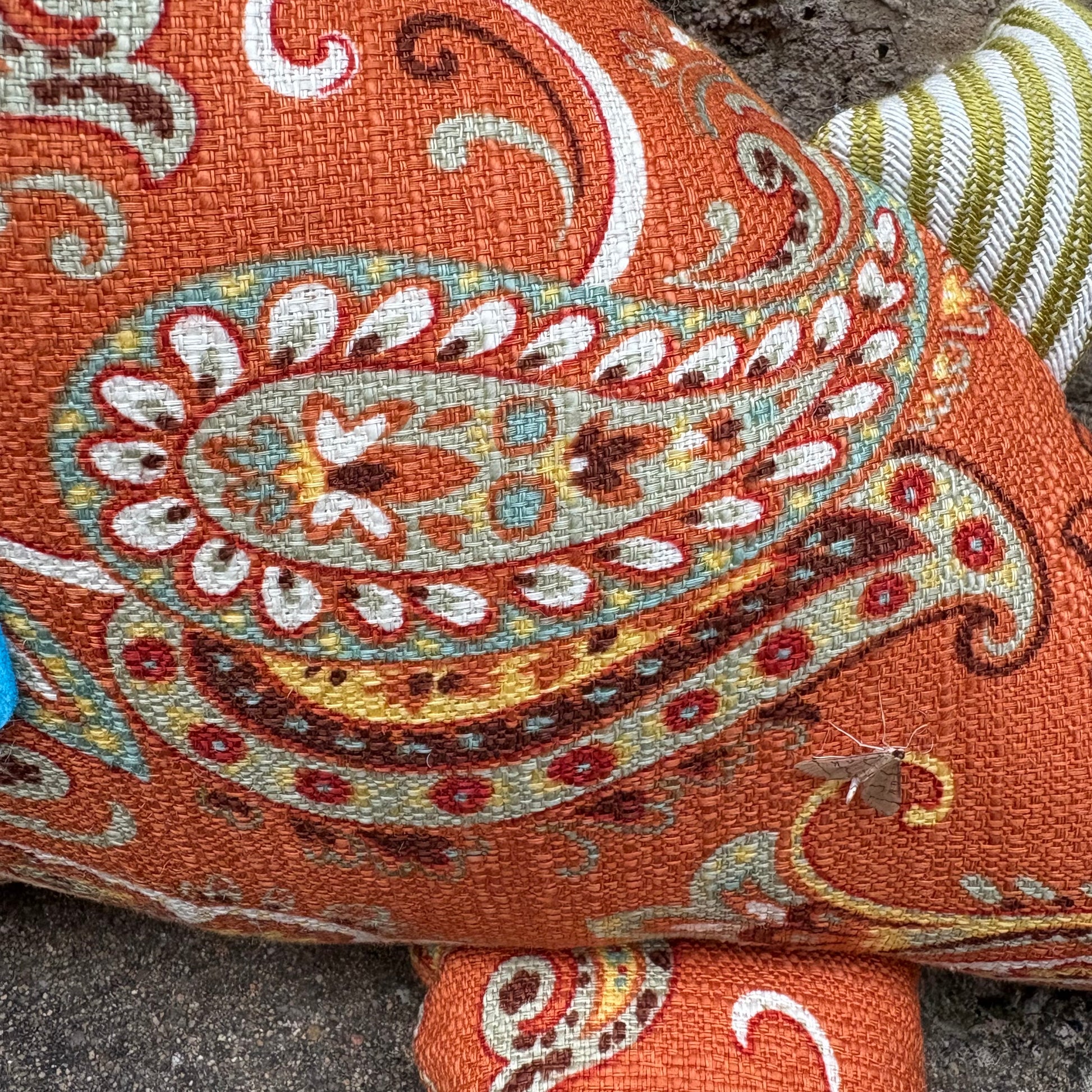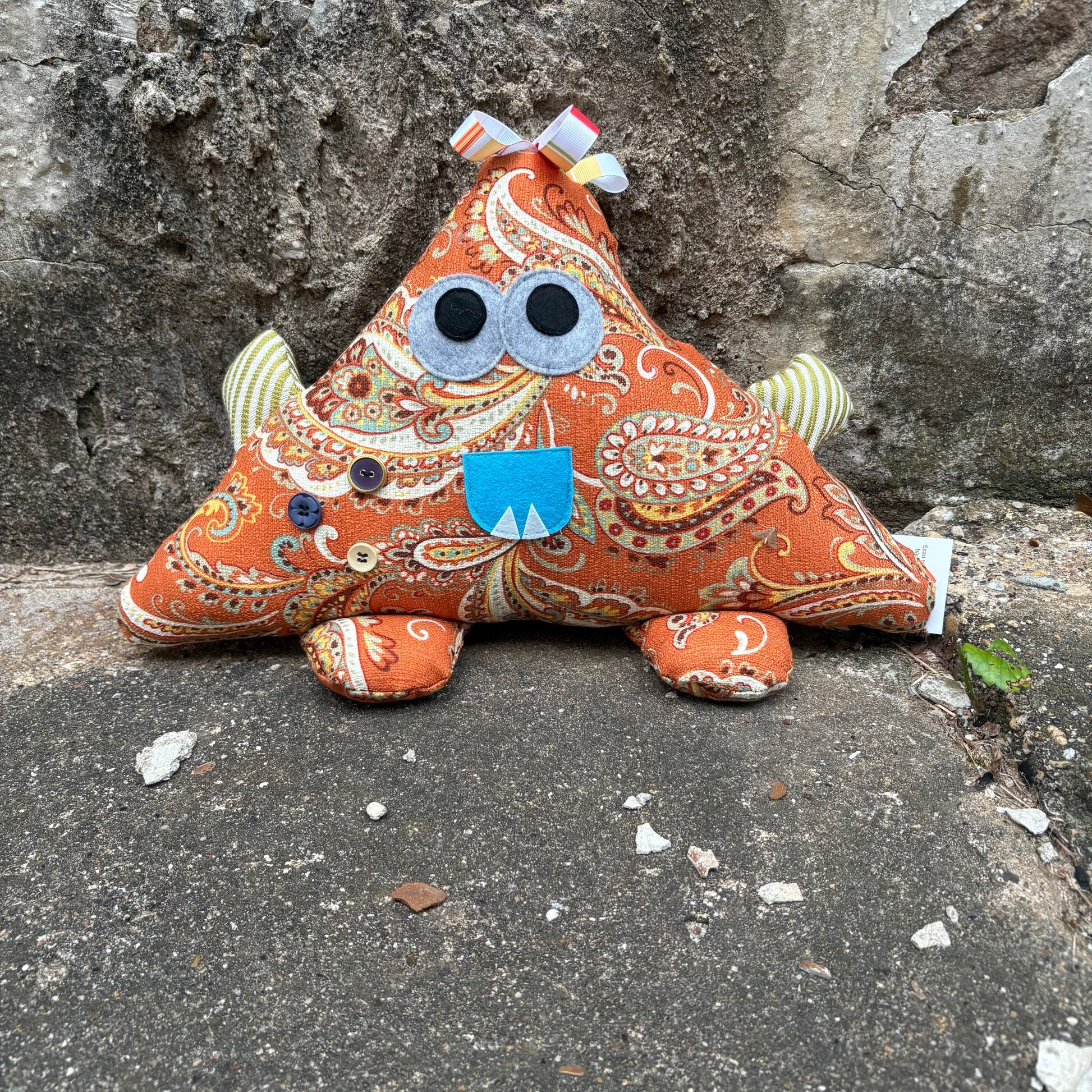 Discover the one-of-a-kind Morgan, a monster made from special orange paisley print fabric. This unique design is sure to make a statement and add a playful touch to any room. Expertly crafted with attention to detail, this monster is a must-have for any monster enthusiast or collector.